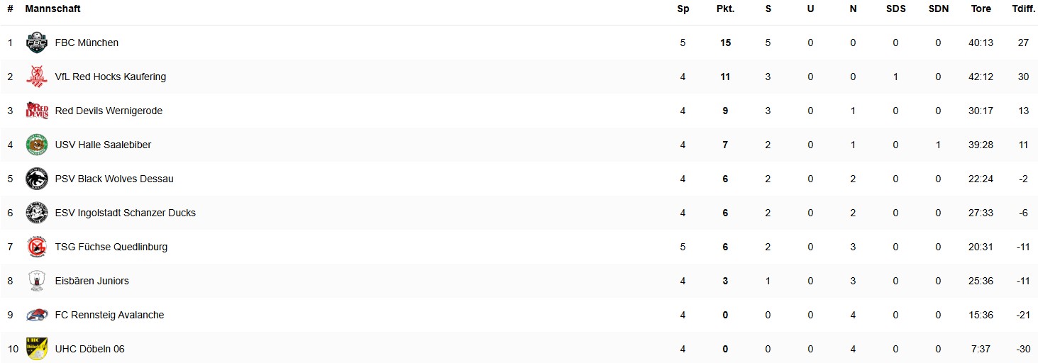 Bayern – Weiterhin zieren zwei bayerische Teams die Spitze der 2. FBL Süd/Ost. Die Red Hocks Kaufering brauchten gegen den UHC Döbeln zwar etwas Anlauf, setzten sich aber schlussendlich mit 10:2 durch. Sogar mit 13:2 die Oberhand gegen denselben Gegner behielt tags darauf der FBC München. Am Samstag hatten die Landeshauptstädter das erste bayerische Derby der Saison gegen den ESV Ingolstadt mit 6:3 für sich entschieden.