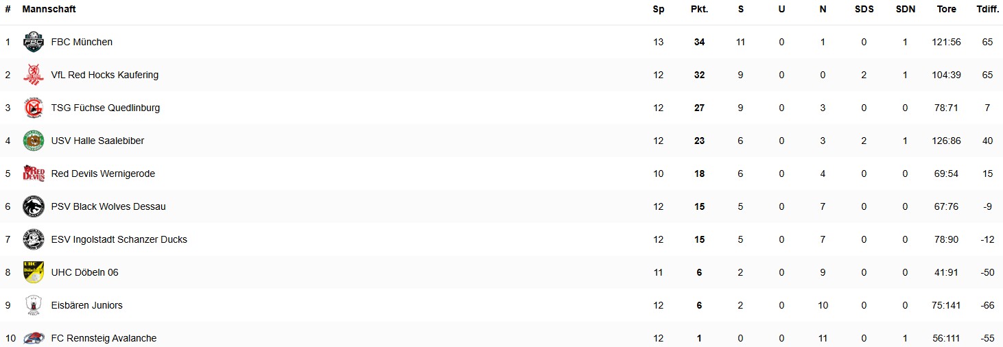 Bayern – Die volle Punkteausbeute haben die bayerischen Teams am Wochenende in sechs Heimspielen eingefahren. Der FBC München und die Red Hocks Kaufering besiegten jeweils die Black Wolves des PSV Dessau und die Eisbären Juniors aus Berlin. Den Schanzer Ducks des ESV Ingolstadt gelangen Big Points gegen die Rennsteig Avalanche und den UHC Döbeln.
