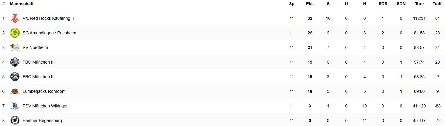 Bayern – Die floorballshop.com Regionalliga Bayern hat ihren Meister 2026 gefunden: Drei Spieltage vor der Ziellinie ist die zweite Mannschaft der Red Hocks rechnerisch nicht mehr von der Spitze zu verdrängen. Am vergangenen Wochenende setzten sich die Kauferinger mit 10:6 gegen den FBC München 3 durch. Dahinter ist das Rennen um den zweiten Platz und damit um die Teilnahme an der Süddeutschen Meisterschaft spannend wie eh und je. Zuletzt besiegte die SG Amendingen/Puchheim den SV Nordheim mit 4:2 im Verfolgerduell. Eine klare Sache war das 15:3 der Lumberjacks Rohrdorf gegen die Wikinger des PSV München. Spannender machten es die Panther Regensburg und der FBC München 2 – am Ende behielten die Landeshauptstädter mit 5:4 die Oberhand.