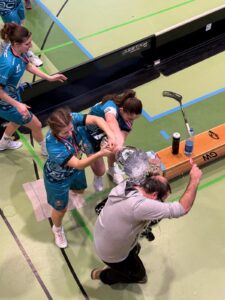 Drießnack: „Die 1. FBL in Deutschland muss das Ziel sein, sonst lohnt sich der ganze Aufwand nicht. Aktuell sprechen die quantitative Entwicklung des Kaders – es werden eher weniger Spielerinnen statt mehr – und das Verfehlen einige Ziele für diese Saison dagegen. In der nächsten Saison planen wir daher erneut mit der WIFL. Das Spiel gegen den SSF Bonn im Pokal hat aber gezeigt, dass wir sportlich durchaus schon wieder mithalten könnten. Finanziell und zeitlich ist die 1. FBL mit Reisezielen wie Berlin, Hamburg oder Mühlheim natürlich nochmal eine andere Nummer. Wir werden, bzw. haben schon damit begonnen, aktuelle U15/U17-Spielerinnen in unseren Trainingsbetrieb zu integrieren. Die sollen im nächsten Jahr dann auch erste Erfahrungen sammeln. Zusätzlich hoffen wir natürlich auch, dass einige Spielerinnen ggf. zurückkommen oder neu dazu, da wir leider auch wieder einige Spielerinnen verlieren. Insgesamt müssten wir uns laut Regularien von Floorball Deutschland jeweils im Januar für die 1. FBL melden. Das bedeutet auch, dass wir zu diesem Zeitpunkt eine belastbare Planung für die 18 Monate danach haben – dies ist in der heutigen Zeit und bei einem so jungen Team einfach auch schwierig.“